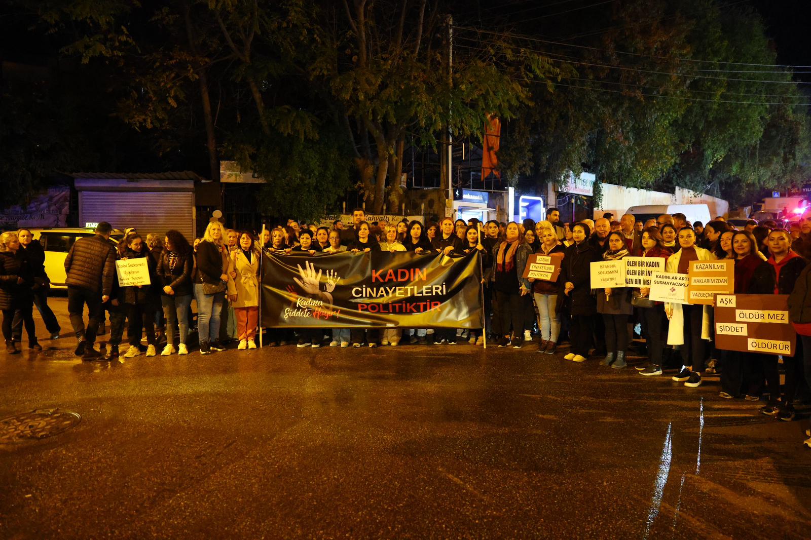 “Kaybettiğimiz her can için, hak, hukuk ve adalet için buradayız” diyen Kınay, “Gülümsemesi yarım kalan, sözü yarım kalan, hayatı yarım bırakılan kadınlar bugün bizimle. Onların sesi bizim sesimizdir, mücadeleleri bizim mücadelemizdir. Sokaklar bizim, meydanlar bizim. Eşitlik, adalet ve umut için sesimizi büyüteceğiz. Kadın cinayetleri politiktir; kadınlar susmayacak, kadınlar korkmayacak. Karabağlar’ın karanlık sokaklarını bu gece birlikte aydınlattık ve bundan sonra da karanlık olan her köşeyi birlikte aydınlatmaya devam edeceğiz” diye konuştu.
